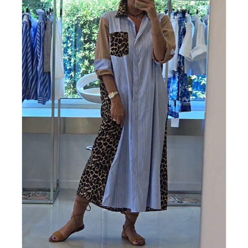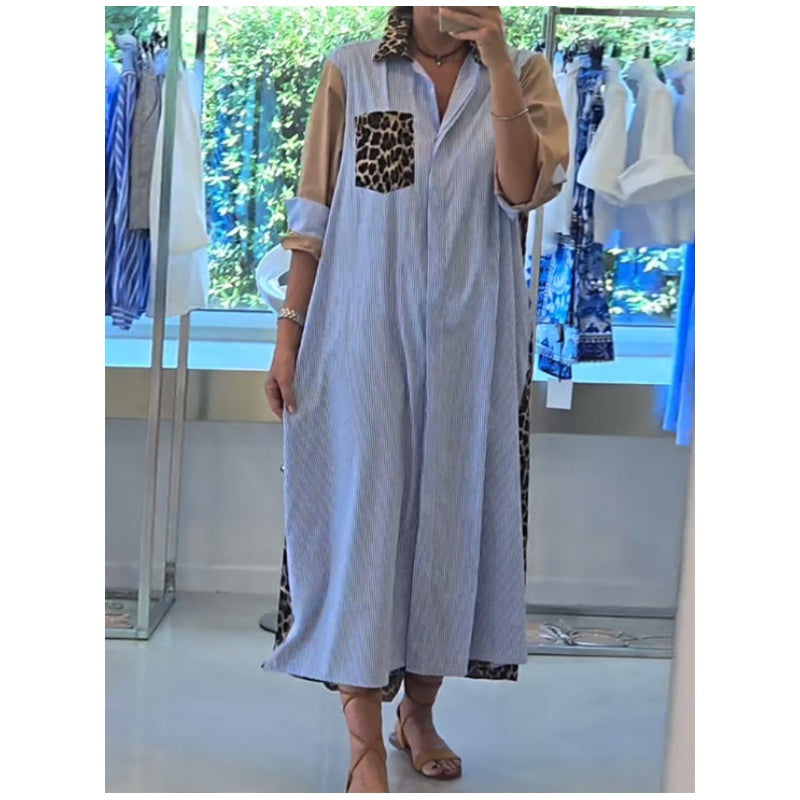 Women's Loose Leopard & Stripe Patchwork Shirt Dress