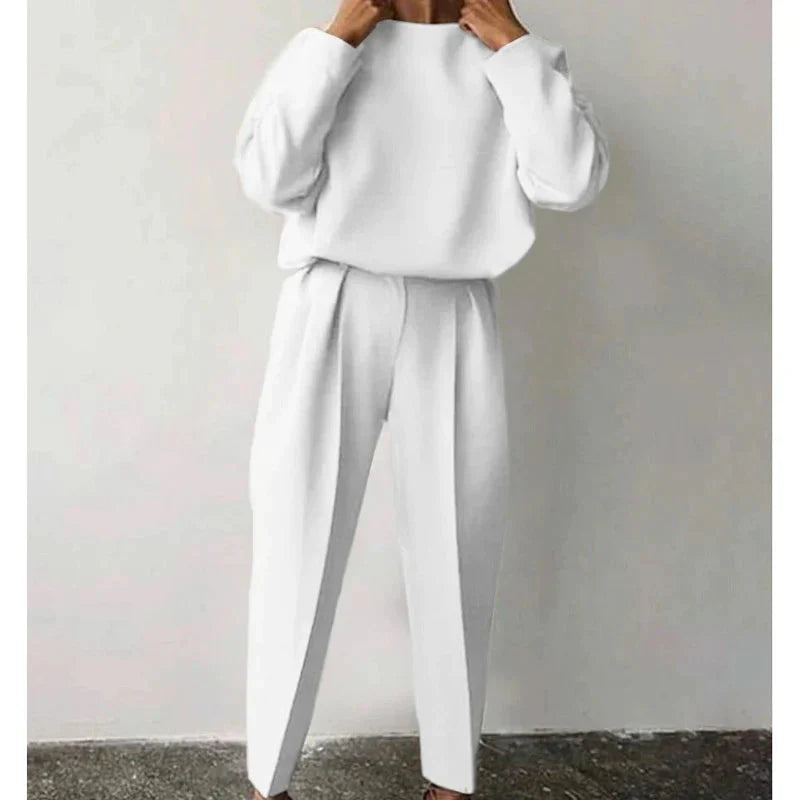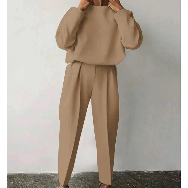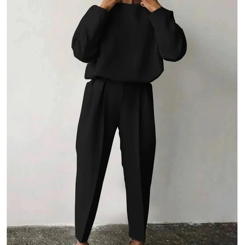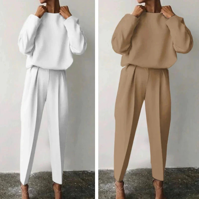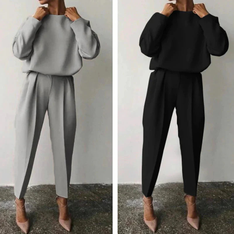 This lounge set includes a comfortable round-neck long-sleeve blouse and straight-leg suit pants. Both are designed in simple solid colors and will never go out of date.