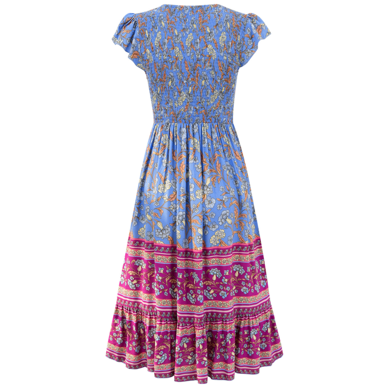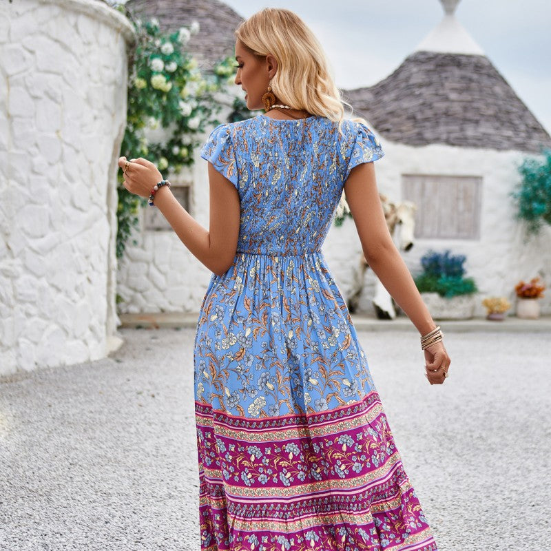 The flowing silhouette and intricate patchwork patterns create a unique and eye-catching look. Whether you're attending a summer festival or strolling along the beach, this dress is sure to make a statement. Elevate your wardrobe with our Elegant Bohemian Style V-Neck Patchwork Dress and embrace the carefree boho chic style.