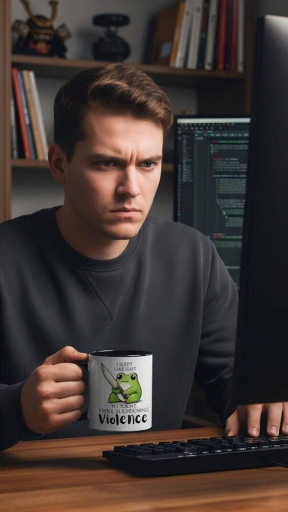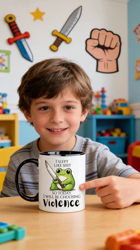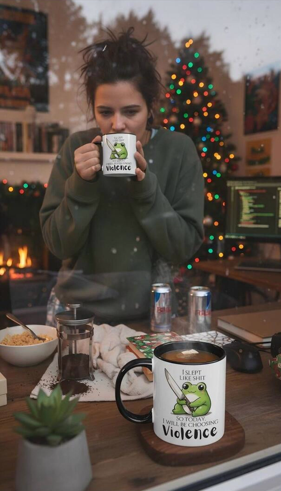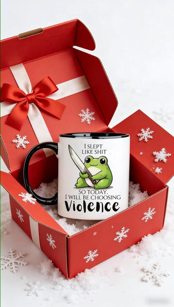 The ultimate stress reliever: Had a rough night? Fill it with coffee and let the cup's slogan shout ‘Opting for violence today’ for you – everyone will instantly get the reference.