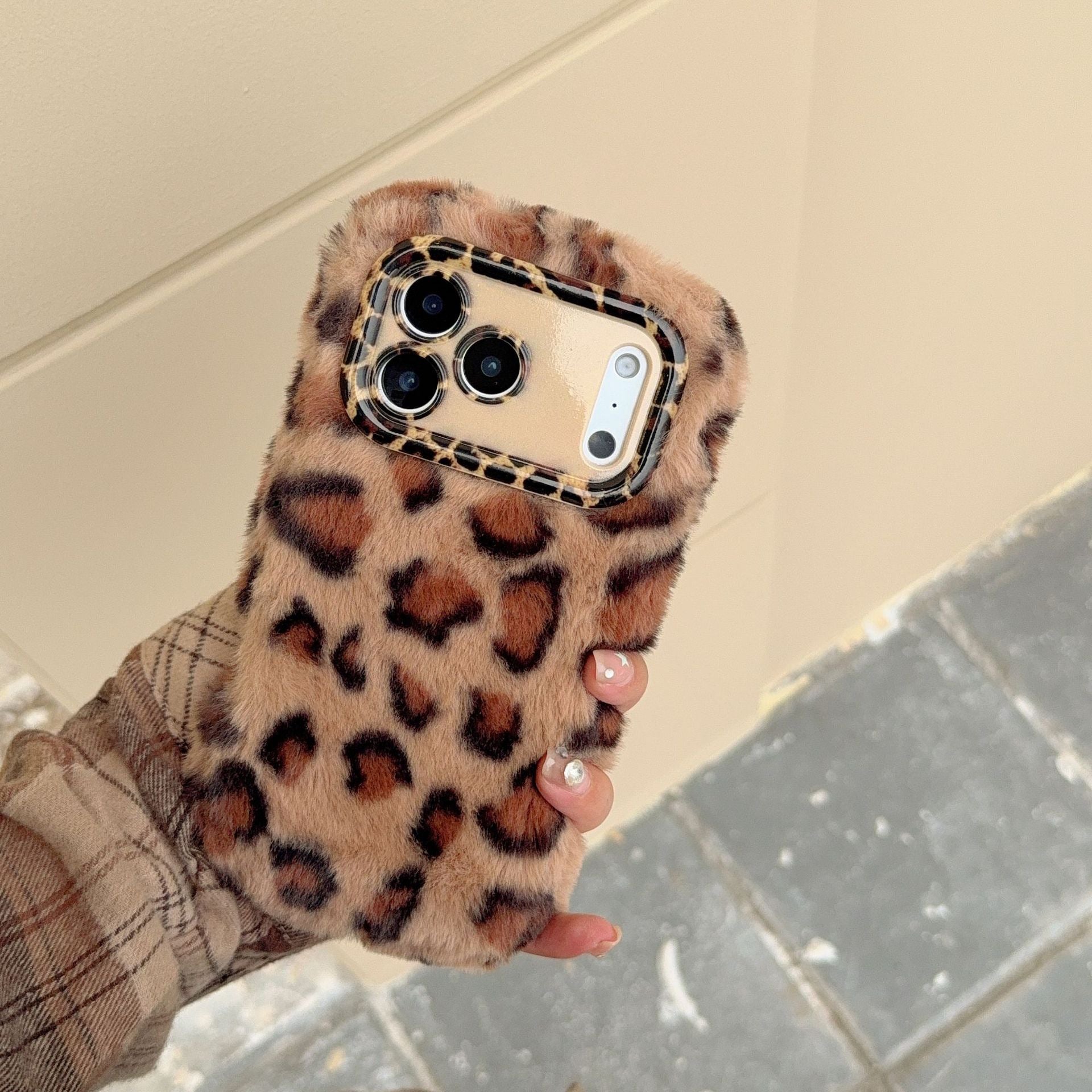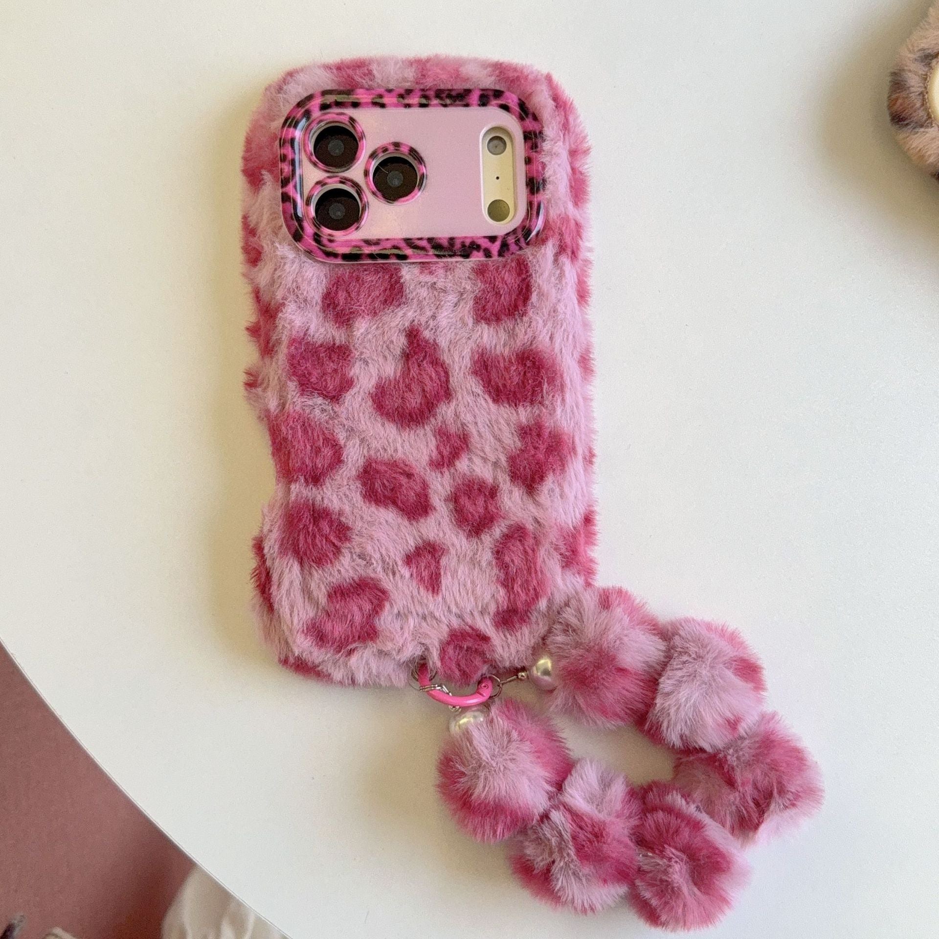 Leopard-print plush phone case (with stand + matching plush wrist strap)