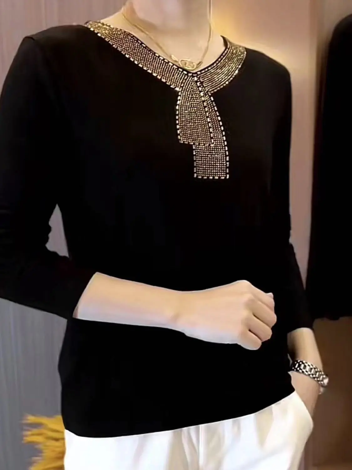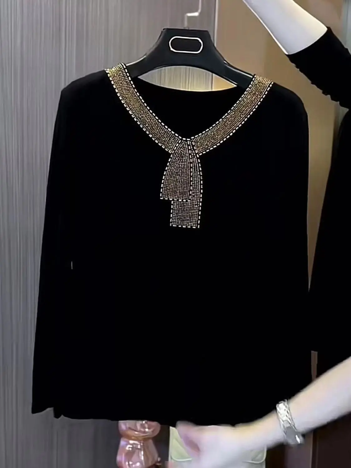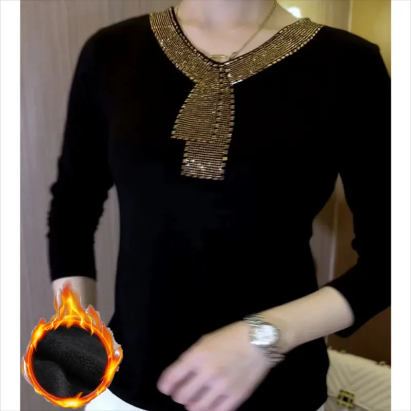 2025 High quality winter velvet long sleeve t-shirt with rhinestones, warm and fashionable