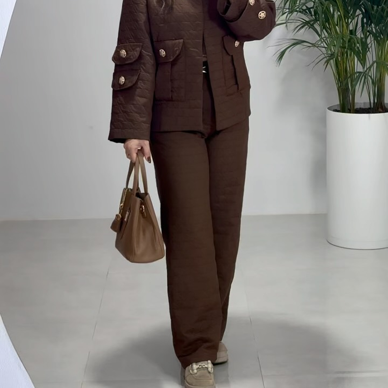 ELEGANT BUTTON DETAILS - Adorned with distinctive, elegant buttons, the coat gains a refined and luxurious accent. These details not only serve as secure closures but also enhance the overall sophisticated aesthetic of the set.