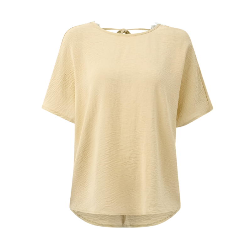 Introducing our Women's Round Neck Loose-Fit Backless Short Sleeve T-Shirt, the perfect addition to your summer wardrobe. This stylish top combines fashion-forward design with ultimate comfort, making it a versatile choice for various occasions.