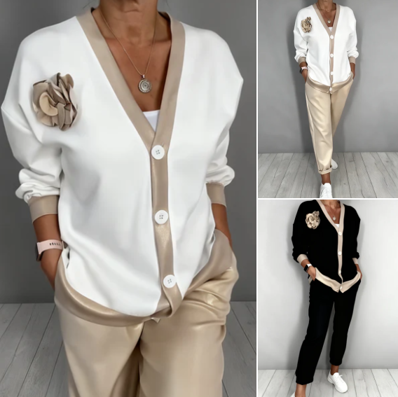 THOUGHTFUL DESIGN ELEMENTS: The long-sleeved V-neck top features a single-breasted front for classic appeal. Complementing this, the high-waist pants include an elastic waistband and convenient side pockets, blending style with functionality seamlessly.