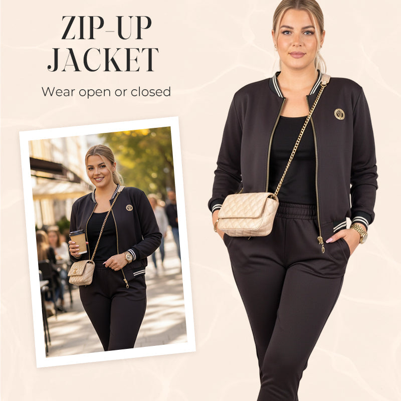 STYLISH ZIP-UP JACKET: Features elegant striped accents on the collar and cuffs, adding a touch of sporty sophistication. The full-zip front offers versatile styling options, letting you wear it open or closed for different looks.
